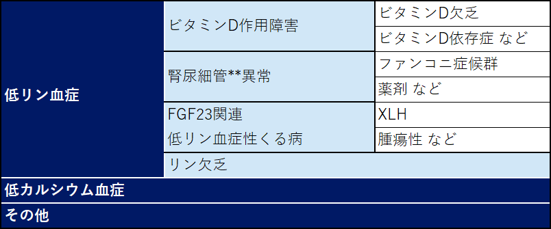 前者は生まれつきの腎臓の異常や、薬物の副作用で起き、ファンコニ症候群と呼ばれます。この場合はほかのもの、たとえば重炭酸イオンも漏れるので、血液が酸性になることが多いです。後者では純粋に低リン血症だけが起こります。