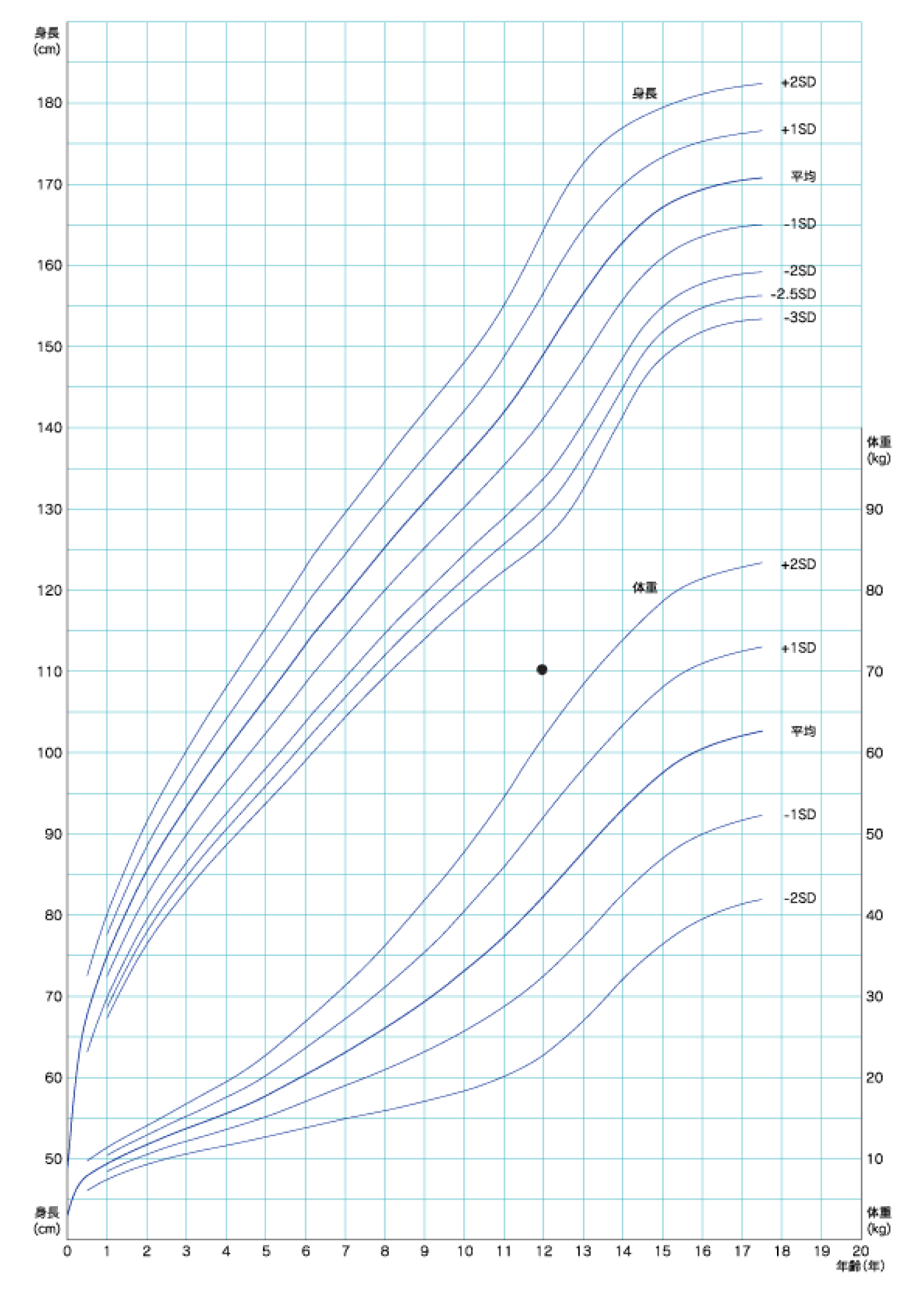 一般的な目安としては、お子様の身長が+2SDと-2SDの線の間、すなわち偏差値にすると30から70の間にあるなら標準の身長です。±2SDの間にあり、線にそって推移しているなら標準の身長です。 -2SD未満は低身長と考えられますので専門医に相談されることをお勧めします。