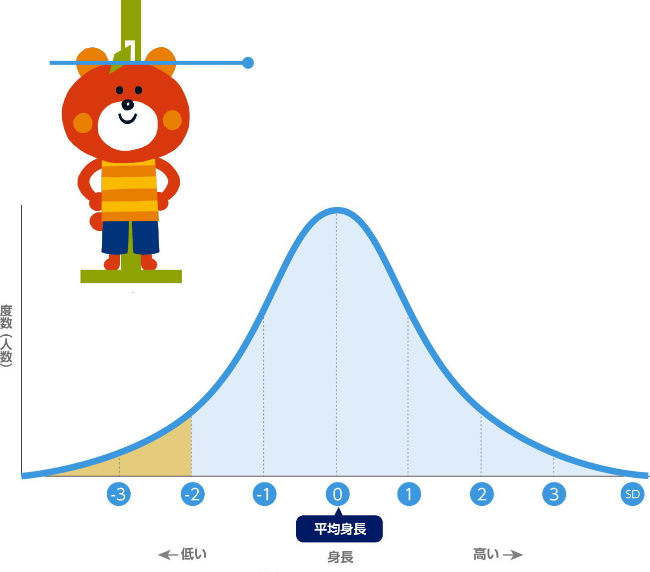 同年齢の子どもが1000人いたとすると約22人が-2SD以下になります。今の身長が標準範囲内でも成長曲線が標準曲線をまたいで低下したり、上昇したりする場合は診察が必要です。